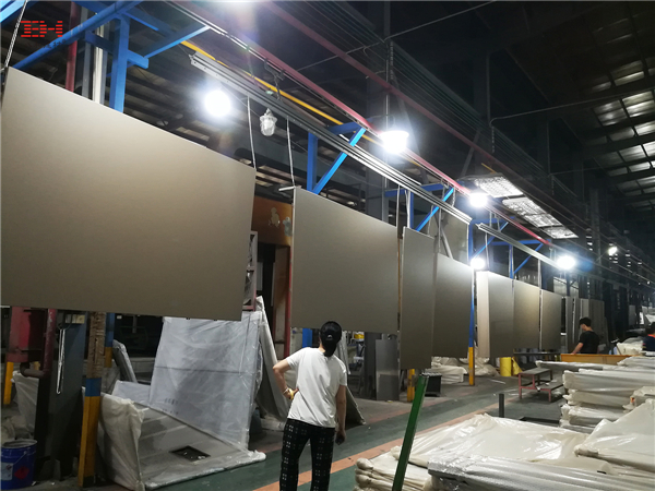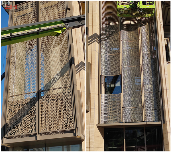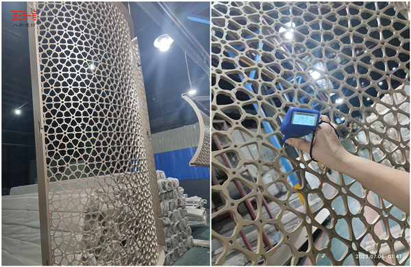 鋁窗花及鋁單板均采用氟碳漆四涂二烤表面處理工藝,膜厚、光澤度、色差嚴格把關,戶外耐候漆可質保20年。