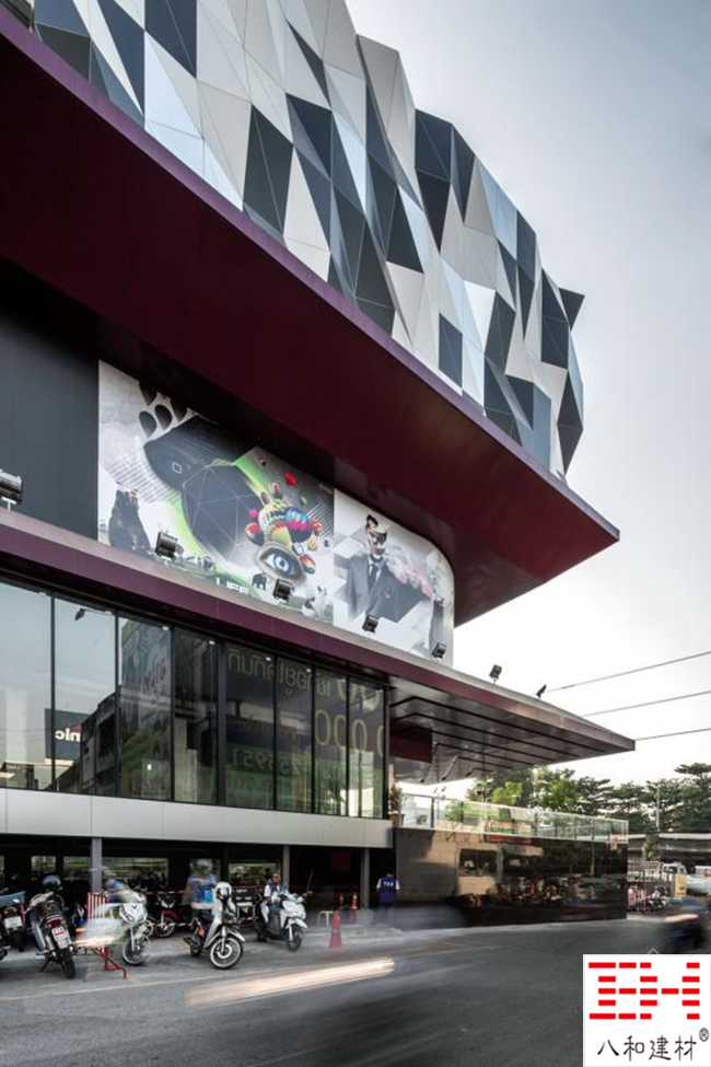 泰國(guó)TUKCOM商場(chǎng)的建筑外觀呈波浪形,運(yùn)用了不同造型的幕墻鋁單板,分為765經(jīng)濟(jì)三角像素。黑色,白色和鏡面加工的幕墻鋁單板通過超時(shí)分布的隨機(jī)算法。暗紅色的鋁單板框架,現(xiàn)有的廣告廣告牌已擴(kuò)大沿一側(cè)外墻的建筑主入口前臉標(biāo)志。
