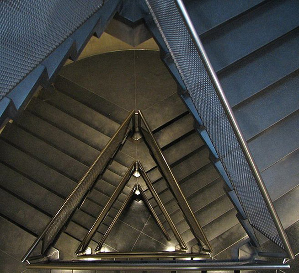 中央的樓梯體現了三角形的模式,使用的是鋁拉網護板,并外部的線條也充當了美術館空間中央的雕塑。