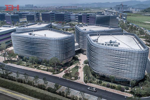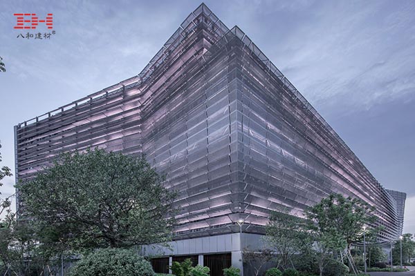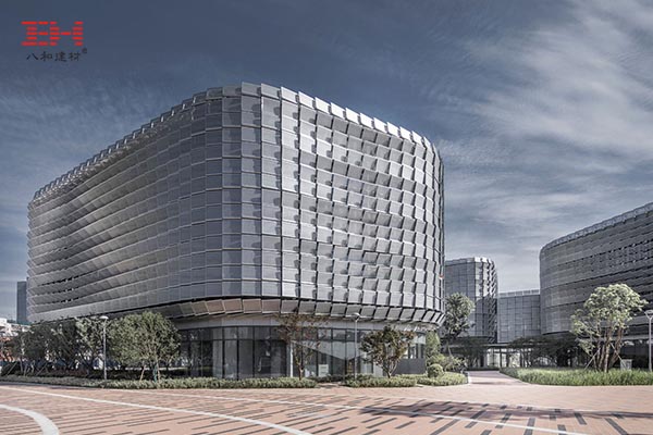寧波前洋E商小鎮(zhèn)位于寧波市江北區(qū)慈孝大道,建筑面積十多萬平方米。小鎮(zhèn)辦公區(qū)的沿街立面之一由3mm厚沖孔鋁單板組合一個(gè)幾百米的遮陽(yáng)百葉板連續(xù)幕墻,科技感十足。