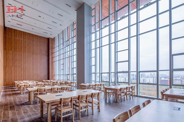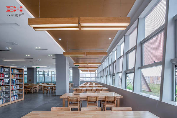 仿木紋鋁單板逼真的天然木材視覺效果和立體木紋觸感效果,有著極高的美觀性的同時,還具備防火、防潮、防腐等功能,在耐候性、硬度、強度上都比實木優(yōu)異。木紋鋁板營造的暖色調(diào)的室內(nèi)環(huán)境,配合簡明通達,開放通透的采光和通風,突出空間的交流和公共性,營造濃厚的學習氛圍。