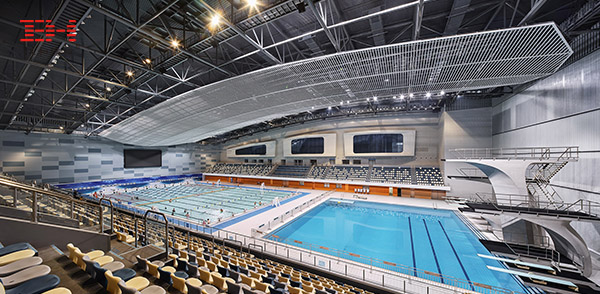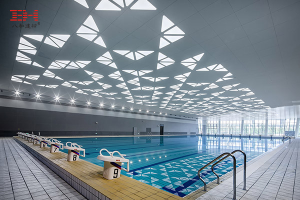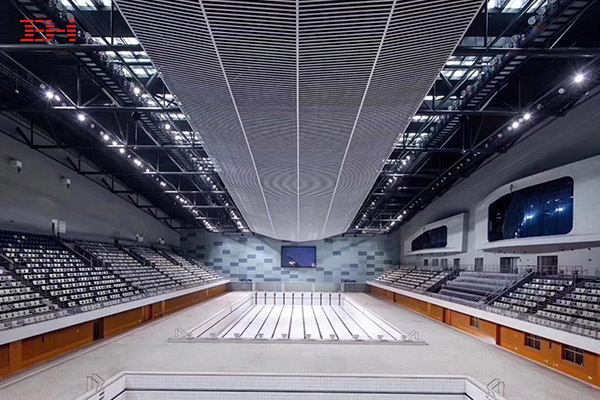 游泳館比賽大廳墻面采用灰色穿孔吸音鋁板,具有良好的吸聲效果。天花運用鋁圓通吊頂遮擋頂部機電結構,序列排布的流式線條與建筑表皮形態呼應。觀眾休息大廳墻面和天花皆采用易檢修、施工的鋁方通,整體效果簡潔明快、清新。