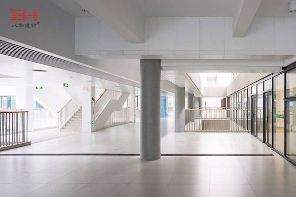 該小學多棟大樓和場館采用了鋁天花吊頂以及鋁型材方通進行裝飾。室內(nèi)天花由銀白色的鋁天花吊頂與鋁型材方通搭配,構(gòu)造成極具線條感的幾何圖案,室內(nèi)鋁方通裝飾的窗花及柵欄的加入,使得立體美感更加明顯。建筑大庭天花及外部天花雖然只采用鋁天花吊頂裝飾,其與室外空曠的環(huán)境以及明亮的自然光相得益彰,給人一種簡潔大方的恢弘感。