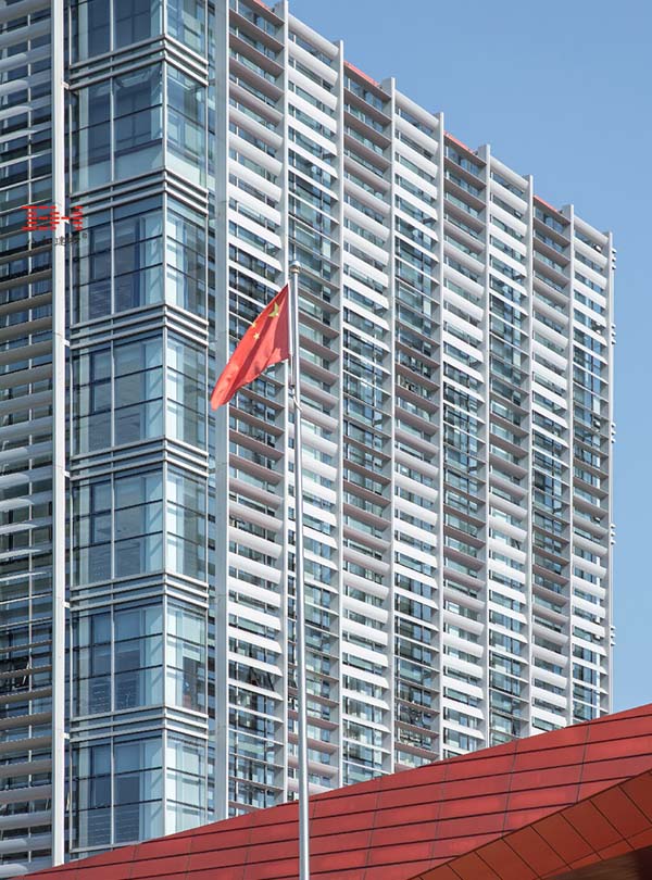 作為警察學校對外的主要界面,這樣的建筑立面具有極高的標志性和很強的辨識度。此外,紅色的折形金屬屋面與規律漸變的遮陽鋁百葉,也作為建筑造型的主要元素而貫穿了整個校園建筑群,形成統一的建筑意象。