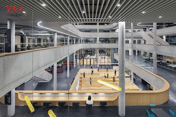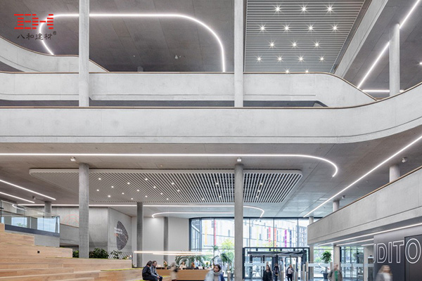 Zalando柏林辦公總部以一個封閉的街區形式呈現,但又著重營造開放透明的態度。鋁方通天花裝飾的引入,正是為了提升大樓內部的通透開闊性。鋁方通在辦公室和公共空間之間形成一個流暢的過渡,為建筑內部提供通透的視野,創造出一種引人注目的工作情調空間,體現Zalando公司的文化特征。