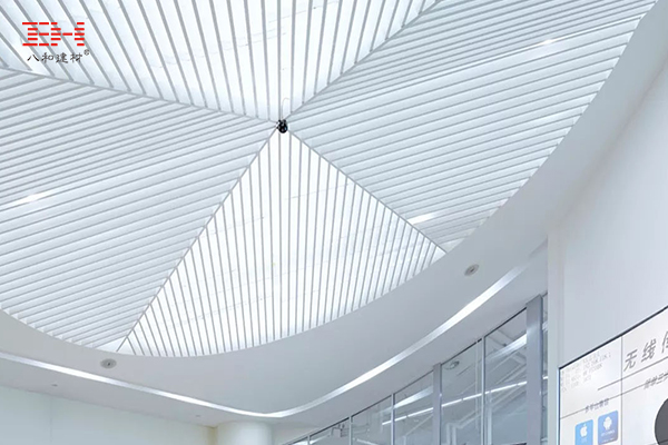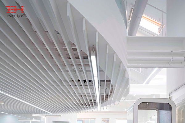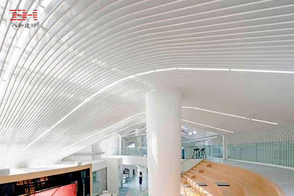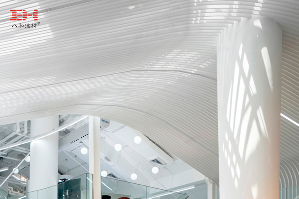 型材鋁方通和弧形鋁方通天花吊頂打造成一個格柵天花,裝飾在天窗下面,分散陽光的直射,采光率恰到好處,自然且溫馨。鋁方通色調(diào)純凈而輕奢,與不同材質(zhì)的室內(nèi)裝飾材料巧妙搭配,共同營造了健康通透的室內(nèi)環(huán)境,舒適休閑,體現(xiàn)公平和人文關(guān)懷。