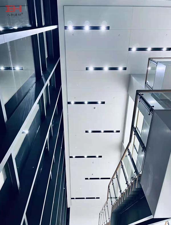 廣東省人民醫(yī)院培訓中心的室內(nèi)裝飾中,墻面和柱子的白色鋼塑復合板的采用,在視覺效果上簡潔干凈,在安裝上方便快捷,在功能上環(huán)保、親膚、防火等。