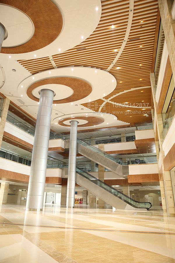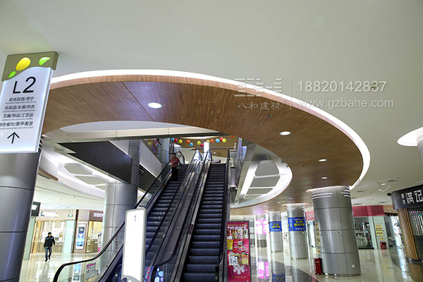 虎門國際購物中心天花采用了造型木紋鋁單板,木紋鋁方通,在LED等的照亮下,讓整個購物中心充滿了創(chuàng)意的色彩,給逛街的顧客一種高檔購物中心的感覺。