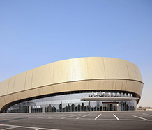 濟南海寧皮革城建筑由南北兩座單體建筑構成,通過東西兩側的連橋將南北建筑形成一體。東側連橋3層高,形成連續界面,西側連橋2層高,輕盈通透。呈流動狀的金屬鋁板幕墻包裹著兩側二至四層高的體量以及東側連橋,形成場地中央半圍合的內廣場。金屬鋁板幕墻呈現豐富多彩變化,結合夜晚燈光布置,具有極強的地標性。