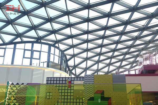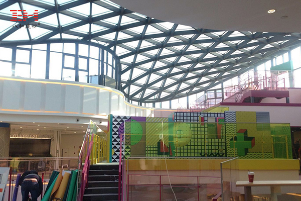 嘉興合樂城,建筑面積110000平米,是一個(gè)大型綜合購(gòu)物中心,其中庭大而空曠,設(shè)置了一個(gè)1500平米的大型生態(tài)中央廣場(chǎng)。中庭頂棚是由型材鋁方管組成的三角形鋁格柵天花加玻璃的結(jié)構(gòu),為室內(nèi)采光和視野提供便利的同時(shí),塑造了一個(gè)美觀、藝術(shù)的天花裝飾。