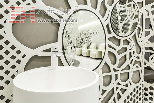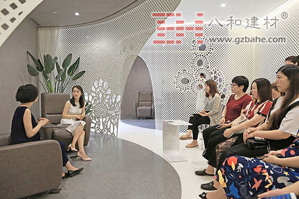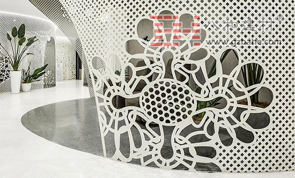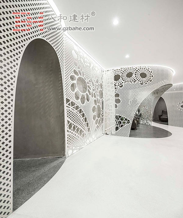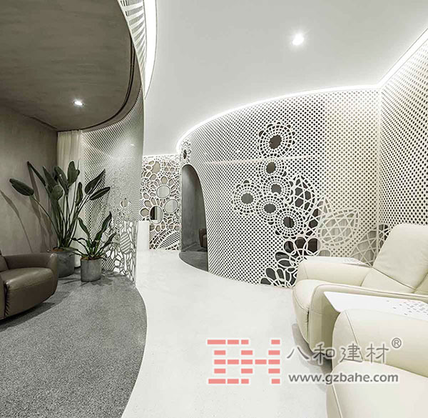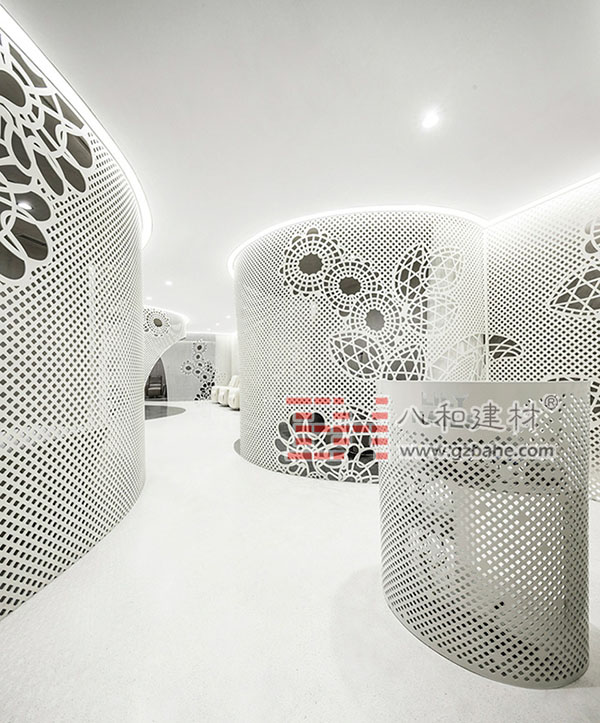 在中國(guó)北京朝陽(yáng)區(qū),八和建材已經(jīng)完成了一個(gè)新的內(nèi)部空間,里面有穿孔的流動(dòng)墻壁,采用的是八和建材鏤空弧形鋁板制成。新的百合美甲沙龍的空間被劃分為不同的空間——通過(guò)持續(xù)的墻壁來(lái)創(chuàng)造柔韌的環(huán)境和女性氣質(zhì),以及改善指甲沙龍的身份和舒適性。