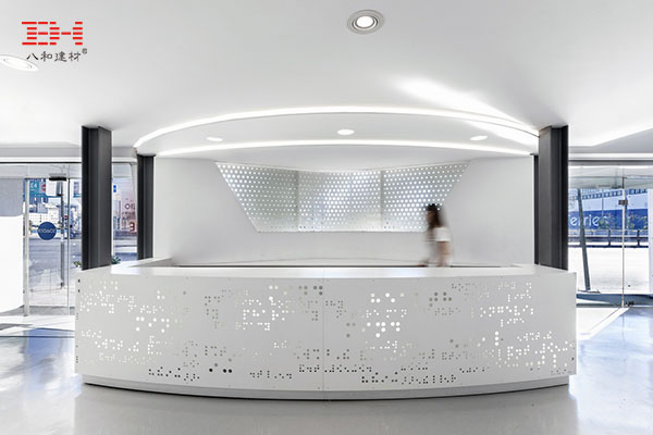 建筑的內(nèi)部,與外立面保持了高度的統(tǒng)一,其中中央服務(wù)臺以有著漂亮穿孔圖案的鋁單板裝飾,服務(wù)臺背景板的穿孔鋁單板采用跟外墻穿孔鋁單板一樣的樣式,從而使室外到室內(nèi)自然銜接起來。