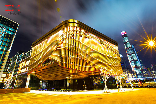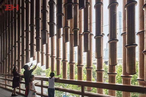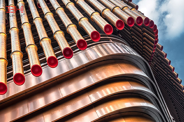上海復星藝術中心外表皮是由鋁圓管組成的三層幕簾,每層幕簾使用不同的古銅金黃色,富有層次感。675根鋁圓管長度不一,直徑各異,重重疊疊地組成三層藝術幕簾,呈現(xiàn)多樣的視覺效果。