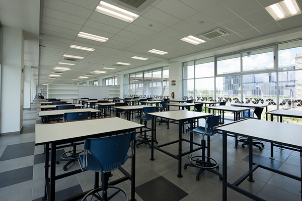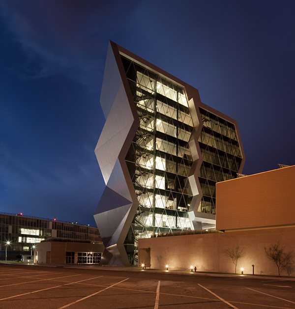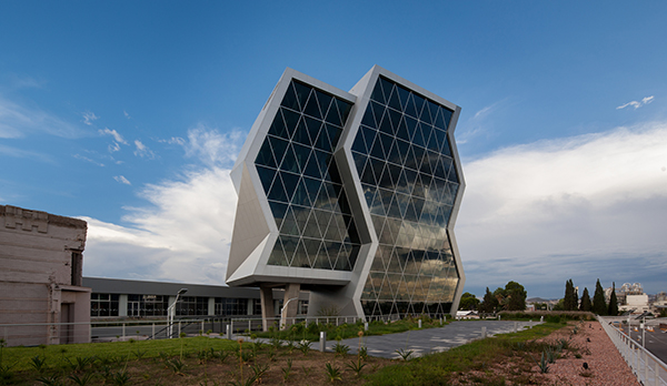 墨西哥奇瓦瓦研究及創(chuàng)新中心是反映前衛(wèi)而創(chuàng)新的設(shè)計。此外,出于對可持續(xù)發(fā)展的理念,建筑師在這個項目建設(shè)中以LEED金牌認(rèn)證為目標(biāo)。建筑外墻采用了鋁單板幕墻及玻璃,室內(nèi)裝飾用了鋁扣板天花,效果更獨特。建筑造型的幾何性受到“隱形”技術(shù)的影響,這種技術(shù)常用于航空及跑車。該建筑設(shè)有墨西哥內(nèi)數(shù)一數(shù)二的大型綠色屋頂,面積達(dá)2500平方米,位于實驗樓屋頂。辦公室和實驗室擁有充足的自然光線,一整天下來幾乎不需要開燈,另外公共區(qū)域的照明通過光伏電池板提供電源。建筑共10層,從中心廣場進(jìn)入,在懸挑體塊內(nèi)設(shè)有三層高的中庭,創(chuàng)建了辦公室職工、學(xué)生及實驗室研究人員之間的公共交流空間。