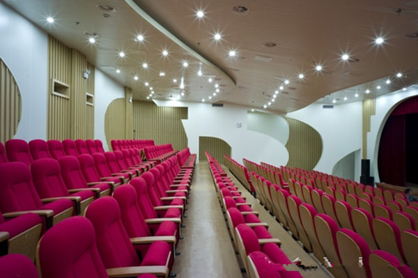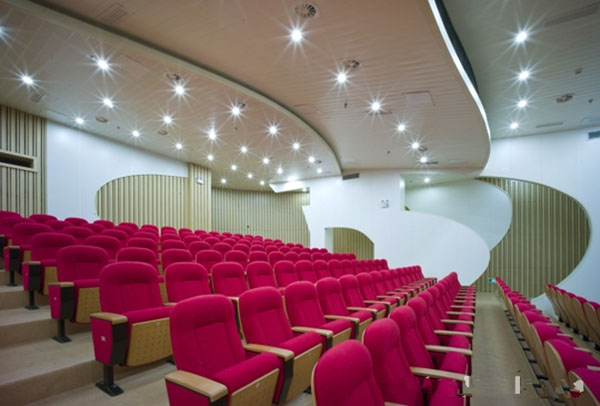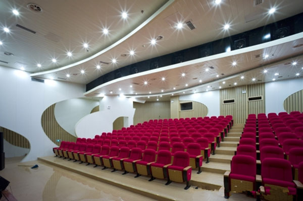 設計師在多功能大廳內運用木色的瓦楞復合板和白色的金屬板在室內勾勒出活潑的弧形線條。