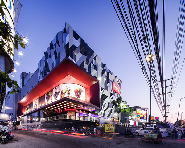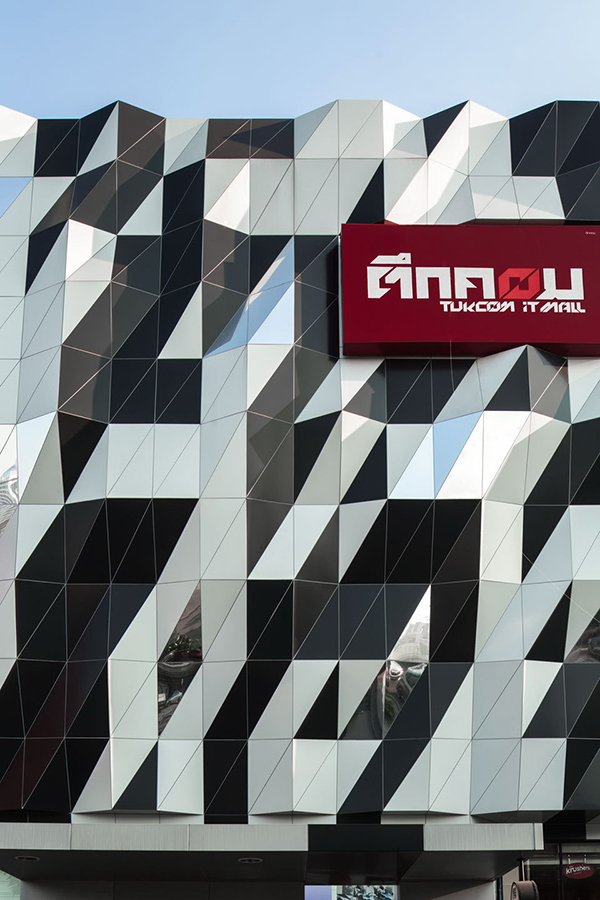 泰國TUKCOM商場的建筑外觀呈波浪形,運用了不同造型的鋁單板,分為765經濟三角像素。黑色,白色和鏡面加工的鋁單板通過超時分布的隨機算法。現有的廣告廣告牌已擴大沿一側外墻的建筑主入口前臉標志。