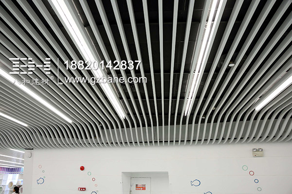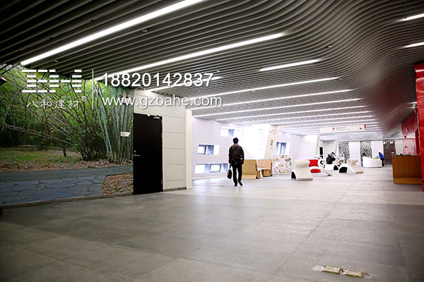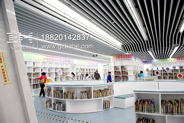 廣州新圖書管層次感極強的天花板,采用的是2.0mm厚的鋁方通,表面聚酯粉處理,厚度上滿足了造型的硬度要求,而表面處理使用白色聚酯粉,為了讓空間看起來更明亮。