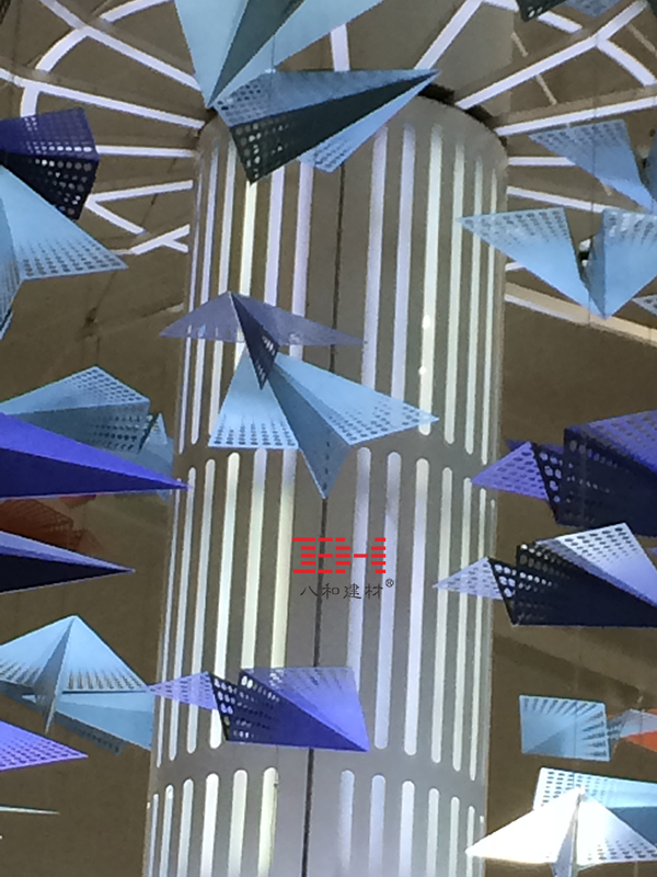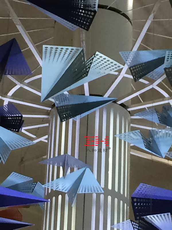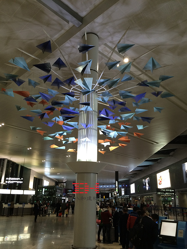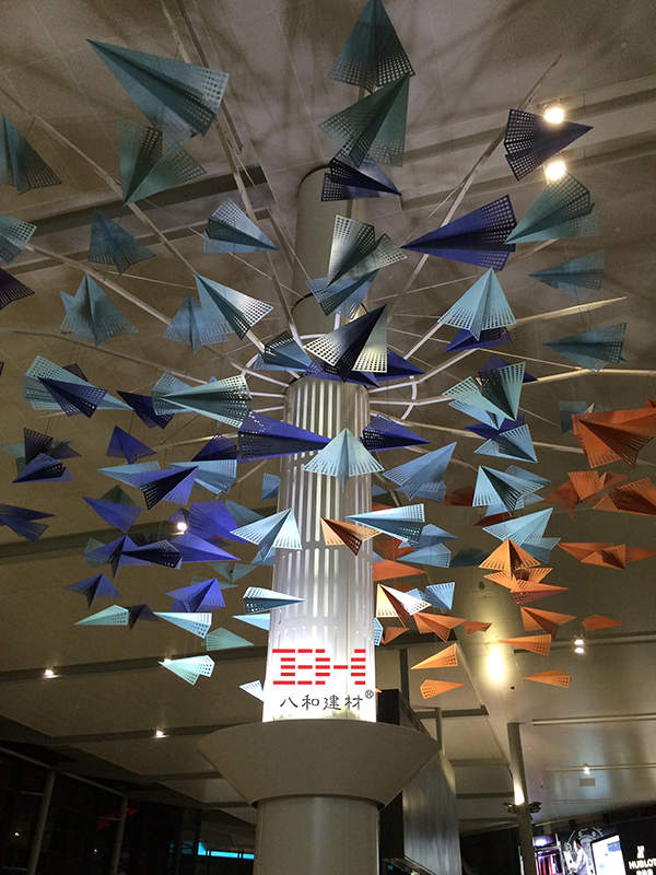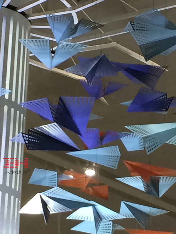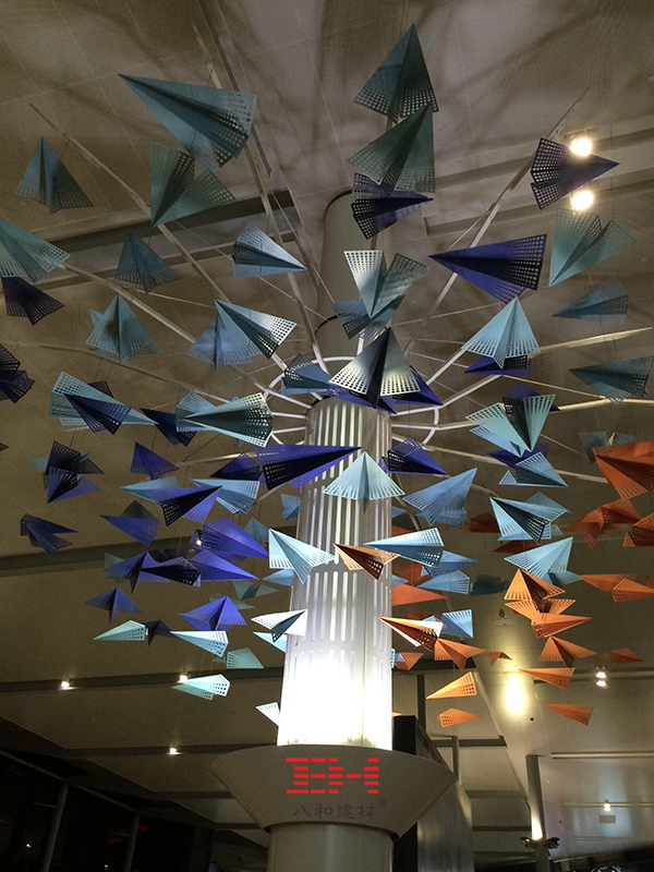還記得的之前做的是鋁單板優質的蝴蝶,用在購物中心中庭的吊頂裝飾,配以五顏六色翩翩起舞的鋁質蝴蝶,整個空間立刻充滿了歡快的動態感覺。這鋁質飛機的效果是一樣的,特別適合空間比較高的室內裝飾,再加上燈光效果,效果沒得說。