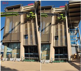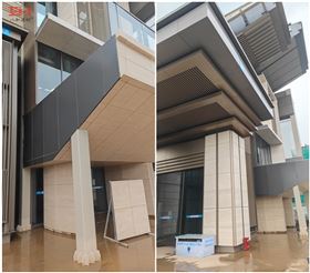 鋁窗花及鋁單板均采用氟碳漆四涂二烤表面處理工藝,膜厚、光澤度、色差嚴格把關,戶外耐候漆可質保20年。