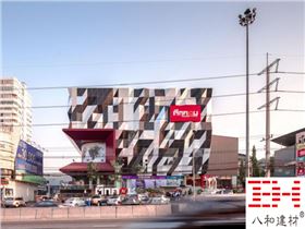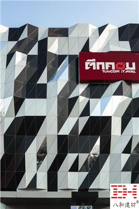 泰國TUKCOM商場的建筑外觀呈波浪形,運用了不同造型的幕墻鋁單板,分為765經濟三角像素。黑色,白色和鏡面加工的幕墻鋁單板通過超時分布的隨機算法。暗紅色的鋁單板框架,現有的廣告廣告牌已擴大沿一側外墻的建筑主入口前臉標志。