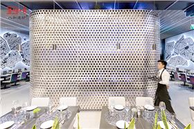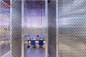 餐廳內部的天花、幕墻、屏風均選用了陽極氧化質感的鋁合金裝飾材料。天花和小部屏風運用的是瓦楞鋁板,幕墻主體部分運用了定制的雕花鋁單板,屏風則是由沖孔鋁單板組裝而成的。設計師通過將這些表面通過了陽極氧化處理的鋁合金金屬建材有機結合,打造出了一個具有時尚感和現代感的餐廳。