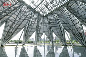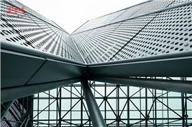 穿孔鋁板附著于結構骨架之上,4cm的孔徑和6cm的孔距,實現了幕墻半透明的鏤空效果。這使得場館遮陽效果和采光需求得到平衡,通風的屬性也保證了室內的舒適自然。感觀上,銀白的穿孔鋁板呈現鎧甲般的金屬感,加上建筑結構的倒梯形設計,展示出動態的視覺效果。