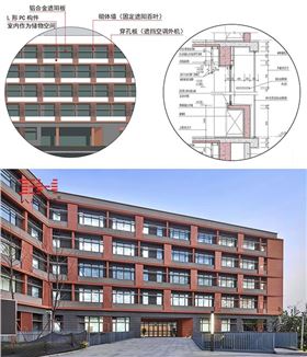 遮陽(yáng)鋁板、穿孔鋁板、鋁百葉與石材涂料組成的學(xué)校幕墻