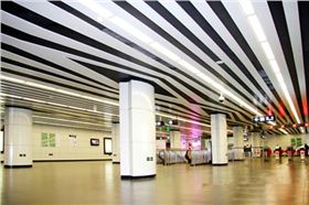北京地鐵10號(hào)線是北京奧運(yùn)交通的重要組成部分,整條線路由西北至東南呈倒“L”形,全長(zhǎng)32.9公里,共設(shè)車站28座,分兩期建設(shè)完成。作為城市中一道靚麗的風(fēng)景線,10號(hào)線一期在裝修設(shè)計(jì)上突出“都市前沿(Metro Frontier)”的理念,意在打造地鐵網(wǎng)絡(luò)中最具現(xiàn)代感、國(guó)際感,體現(xiàn)新北京風(fēng)貌的系列空間。如國(guó)貿(mào)站,強(qiáng)調(diào)站廳、站臺(tái)、通道空間天花部分的曲面構(gòu)成,以弱化空間寬度有限帶來(lái)的壓抑感,并使國(guó)貿(mào)站富有強(qiáng)烈的交通空間流動(dòng)性特征。10號(hào)線的內(nèi)部裝飾共應(yīng)用金屬吊頂產(chǎn)品約38000平方米,其中與奧運(yùn)支線的換乘站—北土城站為有史以來(lái)最大的單體車站。