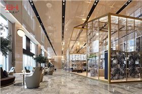 巨大而通透的房子形狀的裝置構架很好的減弱了層高過高帶來的空曠感。沖孔鋁單板的透明的立面架構是“圍”與“透”的結合,打破了原有的景觀結界,使整個空間被完美通透的呈現。