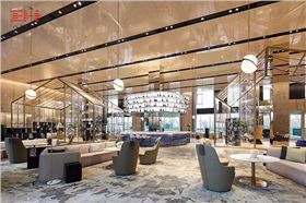 天津融創·星耀五洲為改造項目,外圍立面保留原有的柱體結構,金屬穿孔鋁單板圍合空間形成流暢的圓弧形藝術長廊。