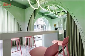 白天,陽光從穿孔鋁板穿進室內,使得店內原本甜美的配色和氛圍更加夢幻。晚上,室內燈光透過穿孔鋁單板外泄,輕盈獨特的感覺引人駐足。古老的廠房背景,金屬感的沖孔鋁板,老建筑與現代設計展現在同一空間,以相互尊重的態度并存。