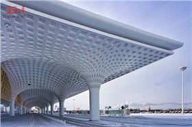 呼倫貝爾海拉爾機場的頂棚屋面設計成像草原一樣連綿起伏的形狀,凸起猶如一個個蒙古包,這就需要對裝飾鋁板進行曲率計算,設計出不同曲率的單曲鋁單板和雙曲鋁單板。