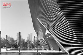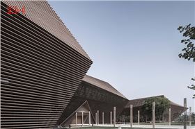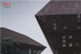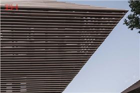 幕墻鋁方通格柵呈古銅色,均勻地橫向排列,構建起三個場館的建筑表皮。金屬格柵幕墻的鏤空特性可以使陽光透進館內,營造生動的視覺感受,配合建筑形態,呈現一種動態的富有張力的空間秩序。