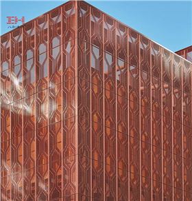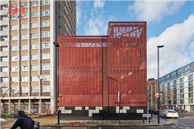英國Bunhill 2能源中心是一個(gè)利用地鐵設(shè)施排放的廢熱,為附近住宅、休閑中心以及學(xué)校供暖的設(shè)施。其外墻使用了深色的金屬穿孔鋁單板,偏紅的配色呼應(yīng)了熱能的主題,區(qū)別于周圍的建筑,格外顯眼。