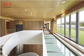 北京華龍私人飛機候機廳,以奢華闊氣的歐式古典裝飾給客人提供無微不至的服務,其天花采用了木紋鋁單板天花吊頂,木紋色調略帶金碧輝煌的奢華感,尊貴且典雅。