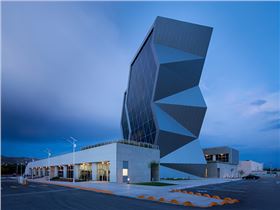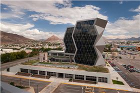 墨西哥奇瓦瓦研究及創新中心是反映前衛而創新的設計。此外,出于對可持續發展的理念,建筑師在這個項目建設中以LEED金牌認證為目標。建筑外墻采用了鋁單板幕墻及玻璃,室內裝飾用了鋁扣板天花,效果更獨特。建筑造型的幾何性受到“隱形”技術的影響,這種技術常用于航空及跑車。該建筑設有墨西哥內數一數二的大型綠色屋頂,面積達2500平方米,位于實驗樓屋頂。辦公室和實驗室擁有充足的自然光線,一整天下來幾乎不需要開燈,另外公共區域的照明通過光伏電池板提供電源。建筑共10層,從中心廣場進入,在懸挑體塊內設有三層高的中庭,創建了辦公室職工、學生及實驗室研究人員之間的公共交流空間。