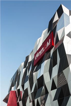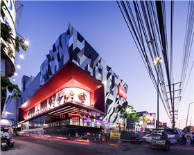 泰國TUKCOM商場的建筑外觀呈波浪形,運(yùn)用了不同造型的鋁單板,分為765經(jīng)濟(jì)三角像素。黑色,白色和鏡面加工的鋁單板通過超時(shí)分布的隨機(jī)算法。現(xiàn)有的廣告廣告牌已擴(kuò)大沿一側(cè)外墻的建筑主入口前臉標(biāo)志。