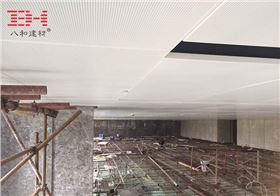 這次中山保利一期項(xiàng)目選用的是八和建材2.0mm厚的沖孔鋁單板吊頂天花,白色的表面,背面加了黑色的吸音棉。沖孔鋁單板天花較之普通的鋁扣板吊頂天花,在規(guī)格尺寸上在更多的選擇,如鋁扣板吊頂常規(guī)最大尺寸為600*1200mm,如果安裝在室內(nèi)空間比較大的地方,會(huì)顯得不夠大氣。這次中山保利一期項(xiàng)目用了大規(guī)格的沖孔鋁單板吊頂天花,需要在背面組裝加強(qiáng)筋,而且安裝結(jié)構(gòu)上要比普通的鋁扣板吊頂更穩(wěn)定,平整度更高。