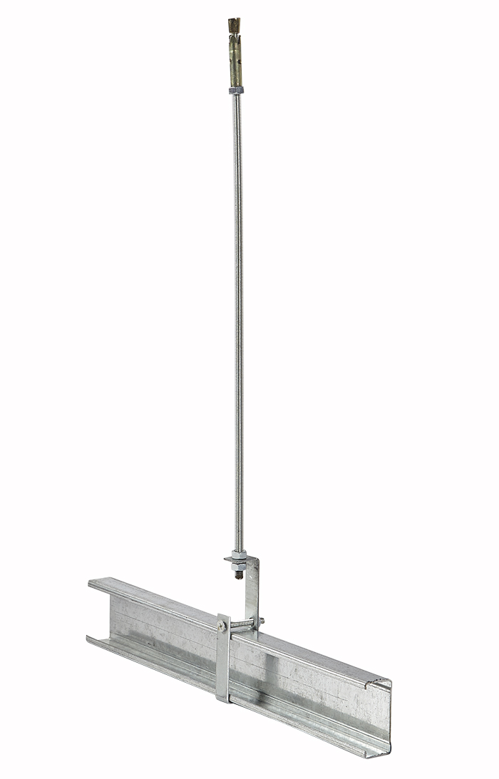 開口槽鋁方通用8厘吊桿加50吊件固定好50定位主骨,再用方通吊件把開口槽鋁方通和50定位主骨固定。