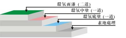 施工工藝:① 防水處理:一樓地面需已做好防水處理; ② 素地處理:依素地狀況做好打磨、修補(bǔ)、除塵; ③ 環(huán)氧底漆:采用滲透性及附著力特強(qiáng)環(huán)氧底漆滾涂一道,增強(qiáng)表面附著力; ④ 環(huán)氧批土:依實(shí)際需要施工數(shù)道,要求達(dá)到平整無孔洞,無批刀印及砂磨印為 準(zhǔn); ⑤ 環(huán)氧面漆:溶濟(jì)型環(huán)氧面漆或止滑面漆滾涂二道,完工后整體表面光亮潔凈,顏 色均一,無空鼓; ⑥ 施工完成:24小時(shí)后方可上人,72小時(shí)后方可重壓。(25℃為準(zhǔn),低溫開放時(shí)間 需適度延長)