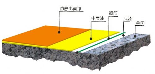 施工工藝:①防水處理: 一樓地面需已做好防水處理; ②素地處理: 依素地狀況做好打磨、修補、除塵; ③防靜電底漆:采用滲透性及附著力特強防靜電環(huán)氧底漆滾涂一道,增強表面附著力; ④環(huán)靜電中涂:防靜電中涂將環(huán)氧樹脂加入適量的石英砂,用鏝刀將其均勻涂布一至